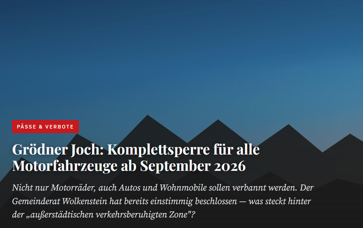 19. März 2026: Grundsatzbeschluss Wolkenstein Gemeinderat stimmt einstimmig für „außerstädtische verkehrsberuhigte Zone ». Politisches Signal, noch kein Rechtsakt. 1. September 2026: Beginn der Testphase Sperrung für alle Motorfahrzeuge (außer Anlieger, Übernachtungsgäste am Joch, Lieferanten, ÖPNV). Weitere Gemeinden – u. a. Corvara und St. Christina – sollen folgen. 1. Februar 2027: Ende der Testphase Die Testphase ist auf fünf Monate angelegt. Danach sollen die Ergebnisse ausgewertet werden. Ab Mitte Mai 2027: Geplante Saisonsperre Bei positivem Ergebnis: Dauerhafte Sperre von Mitte Mai bis Mitte Oktober – also die gesamte Hauptsaison für Motorrad- und Autoreisende.